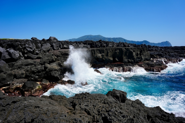 溶岩流によって形成された黒い岩石が広がる絶景スポットで、八丈島の西側に位置するため美しい夕日を眺めることができます。