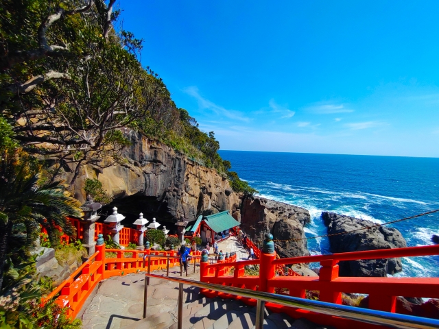 海を見下ろす断崖絶壁の洞窟内に本殿があり、神秘的な雰囲気が漂う人気の観光スポットです。